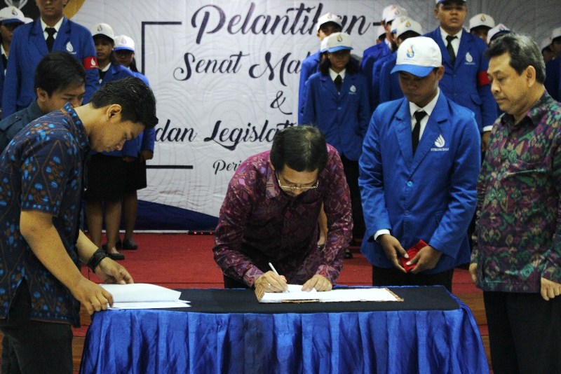 Denpasar- Ketua STIKOM Bali Dr. Dadang Hermawan didampingi Pembantu Ketua III Bidang Kemahasiswaan Ida Bagus Suradarma, SE., M.Si melantik I Putu Adi Santana Putra sebagai Ketua Badan Legislatif Mahasiswa (Balma) periode 2018 – 2019 dan Imam Faqih Bhagaskara sebagai Ketua Senat Mahasiswa (Sema) STIKOM Bali periode 2018-2019, pada akhir tahun lalu, tepatnya pada 21 Desember 2018.