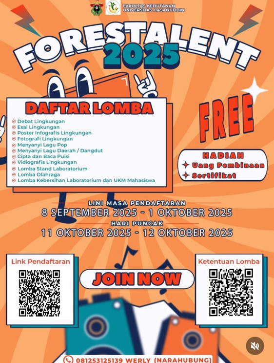 FORESTALENT 2025 merupakan ajang kreativitas dan kompetisi nasional yang menjadi wadah bagi generasi muda untuk menyalurkan minat, bakat, serta kepedulian terhadap lingkungan. Lomba ini menghadirkan berbagai cabang seperti debat, esai, fotografi, poster, dan seni pertunjukan. Selain hadiah dan sertifikat, kegiatan ini juga memberikan kesempatan bagi peserta untuk memperluas jejaring dan mengasah kemampuan dalam bidangnya.